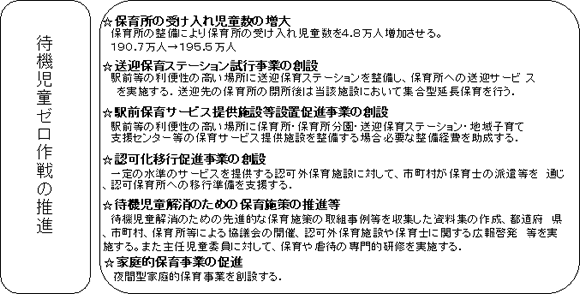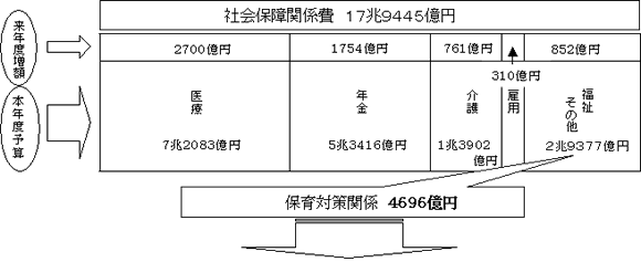今回の概算要求の特徴は、高齢化等による医療費の自然増が、現行制度下では5500億円となりますが、これを制度改正により半分以下に圧縮しているのに対し、小泉首相が掲げる「待機児童ゼロ作戦」を推進するために、子育て支援に力点を置いていることが挙げられます。 |