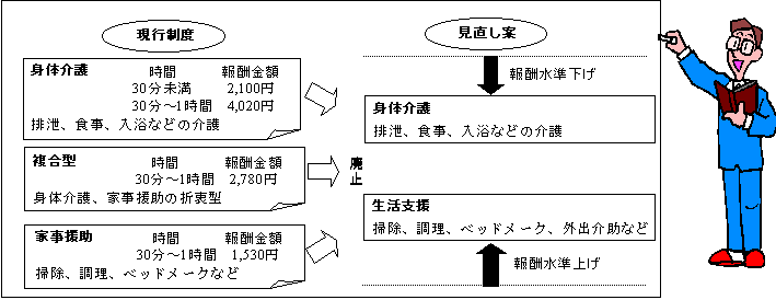 厚生労働省は、介護保険から訪問介護サービスに支払う介護報酬について、2003年度見直し案をまとめました。現行制度の訪問介護サービスの内容については下記表のとおりですが、これを報酬区分に応じて「身体介護」・「家事援助」・「複合型」とに区分されています。今回の厚生労働省の見直し案は、この区分を「身体介護」と「生活支援」の2区分に簡素化するというものです。また、区分による報酬の格差も縮小する方針です。