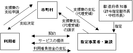 [ 図解説 ] 利用者は利用したい施設と直接契約を結び、その際に市町村に対して支援費の支給申請をします。市町村がこれを認めた場合に支給が決定され、支援費は施設が代理で受領します。