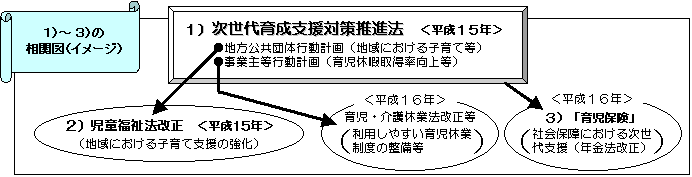 先に発表された「少子化対策プラスワン」を受け、少子化対策に向けての具体的な行動計画の策定を自治体や事業主などに義務づけるものです。主な内容は以下の通りです。