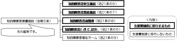 知的障害者デイサービスセンター(施設数157):知的障害者デイサービス(18歳以上の知的障害者またはその介護を行う者を知的障害者デイサービスセンターやその他省令で定める施設に通わせ、社会生活への適応に必要な訓練、介護方法の指導などを行うこと)を提供する施設。利用者に対し、園芸・美術・書道などの文化的活動や日常生活動作等の機能訓練、作業訓練などのほか、給食や入浴のサービス、家族(介護者)に対する介護及び生活援助方法の指導などを提供します。(注・デイサービスセンター自体は上記のように知的障害者援護施設の一つですが、デイサービス事業は施設サービスではなく、居宅サービスとして位置づけられます)