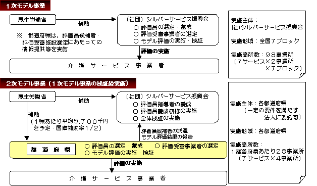 厚労省は今年度、(社団)シルバーサービス振興会に委員会を設置し、第三者評価の実施方法や評価基準等の検討を行っており、16年度はその成果をふまえて、訪問介護・訪問入浴介護・福祉用具貸与・通所介護・特定施設入所者生活介護・介護老人福祉施設・介護老人保健施設の7サービスを対象としてモデル事業を実施することとしています。